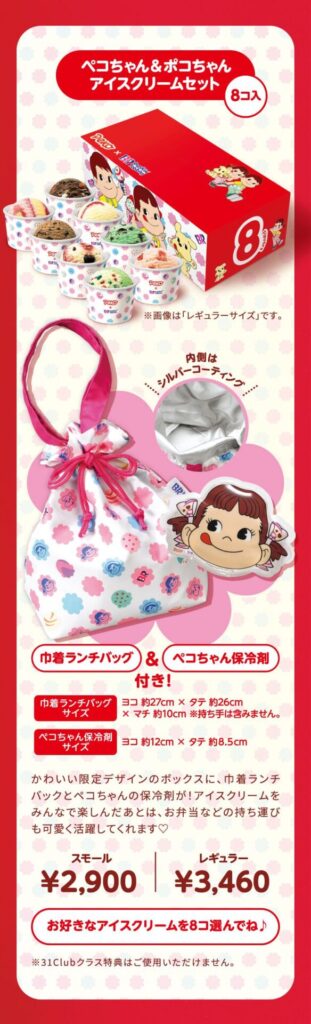 | ペコちゃん&ポコちゃん アイスクリームセット | アイス8コ入り+巾着ランチバッグ+ペコちゃん保冷剤付き |