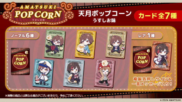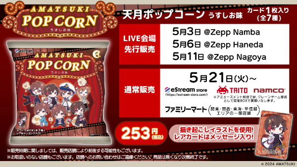 人気歌い手「天月」のポップコーンが発売決定しました!2024年5月21日(火)よりファミリーマートやeStream Storeで取扱い開始。天月の描き下ろしイラストが描かれたカードがポップコーンに付いてくる♪ノーマルカード6種、箔押しサインと一言メッセージ入りのレアカード1種がラインナップ。ランダムで1枚付いてくるのでワクワクする♡また、クレーンゲーム景品としてポップコーン4袋入りの限定BOXが登場するのでお楽しみに♪