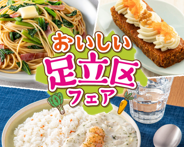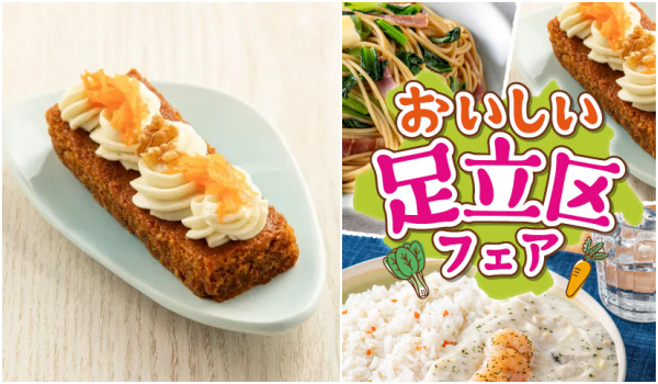 セブンイレブン足立区フェアでは、楽ベジの小松菜バター醤油スパゲティ、おいしい給食のえびクリームライス、くるみ入りシナモン香るキャロットケーキが足立区限定・期間限定販売。