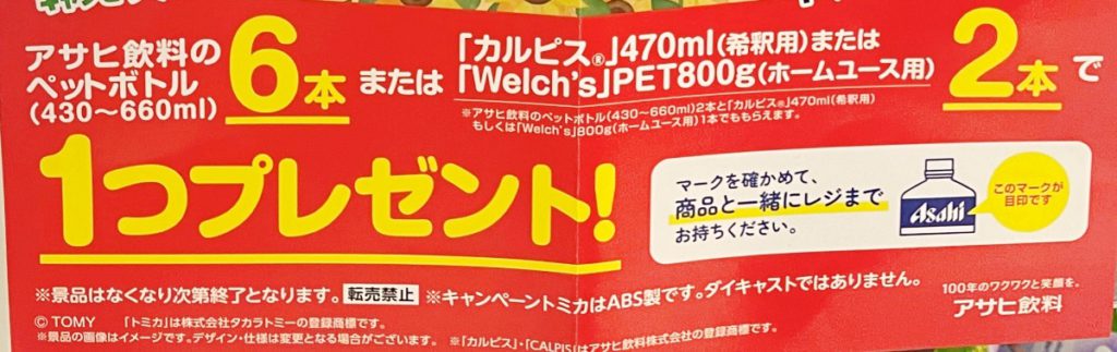 | トミカ1つもらえる 対象商品 | ・アサヒ飲料のペットボトル(430ml~600ml)6本 または ・「カルピス」470ml(希釈用)または「ウェルチ」PET800g(ホームユース)用2本 |