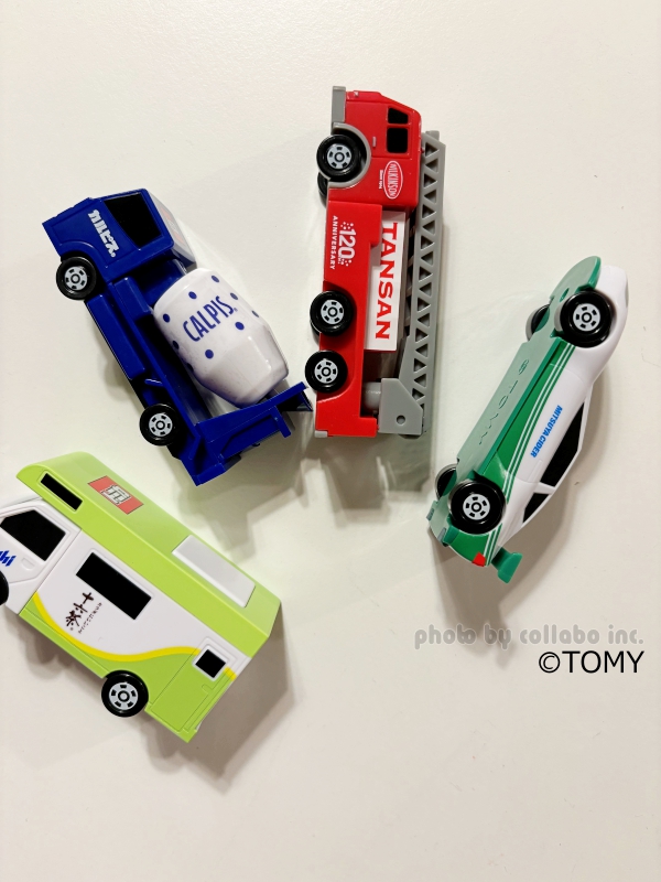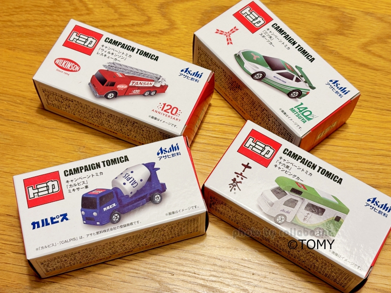 アサヒ飲料では「アサヒ飲料 コラボ限定トミカ」がもらえるプレゼントキャンペーンが開催!2024年第二弾となる新たなトミカ4台がおまけ(景品)として登場し、注目されています。キーをさして走る「カルピス」デザインのスポーツカーに、ハシゴがのびる「三ツ矢」デザインのレスキューカー。ドラムがまわる赤い車体の「ウィルキンソン」ミキサー車、おでかけ気分が楽しめる爽やかな「颯」デザインのキャンピングカーの4台。どれもコラボならでは!リアルな働く車、遊ぶ車の展開が楽しいですね。