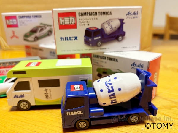 アサヒ飲料のおまけいつも楽しいですよね。コラボトミカは4種類のドリンクとコラボしていて特別仕様がいいですね。カルピスミキサー車夢がありますね。