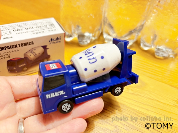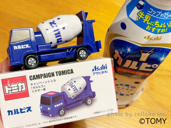 こちらはトミカ好きだけでなく、ミニチュア好きの女子にもウケそうなカルピスコラボのミキサー車です。ミキサー部分がくるくる回るギミック付で楽しい。