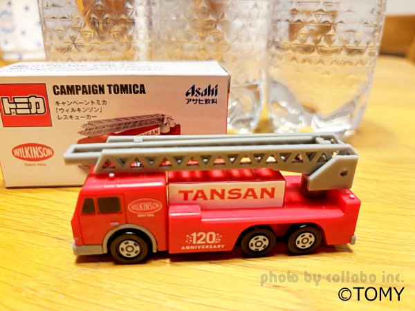 今年で120周年を迎える「ウィルキンソン」のコラボトミカはレスキューカー。赤いボディにTANSANの文字もかっこいいです。