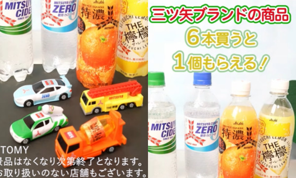 ・店舗の店頭でアサヒ飲料対象商品「三ツ矢ブランド」ペットボトル6本購入でトミカ1個もらえる!