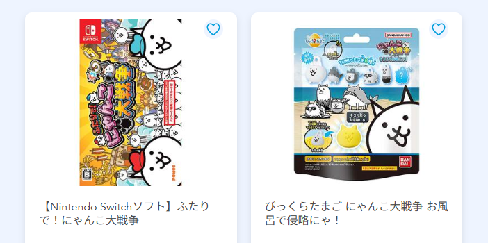 トイザらスでのにゃんこ大戦争グッズ取り扱いは多くはないものの、Switchのゲームソフトやびっくらたまご(入浴剤)、カプセルトイなどでスポット的に販売されています。