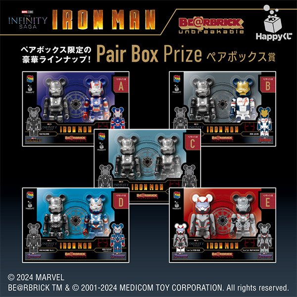 | ペアボックス賞[全5種] | BE@RBRICK 100% 2体セット(ボールチェーン付き) A [WAR MACHINE]& [IRON PATRIOT] B [WAR MACHINE Mark 2]& [IRON LEGION] C [WAR MACHINE Mark 3]& [WAR MACHINE Mark 4] D [WAR MACHINE Mark 6]& [IRON PATRIOT [ENDGAME Ver.]] E. [Team Suit IRON MAN]& [Team Suit WAR MACHINE] |