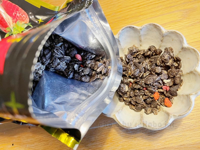 中身は全体的に黒いフルグラが入っています。高級感もありますね。このまま食べてもザクザク触感が増していて、チョコ風味が贅沢に味わえました。お菓子みたいなのに食物繊維も取れる朝食にもおやつにも満足度高い味と触感です。