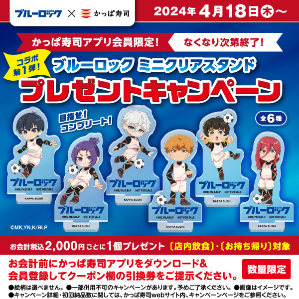 ブルーロック×かっぱ寿司コラボ!第1弾2弾ミニクリアスタンド、ステッカーキャンペーン!コンプめざそう!
