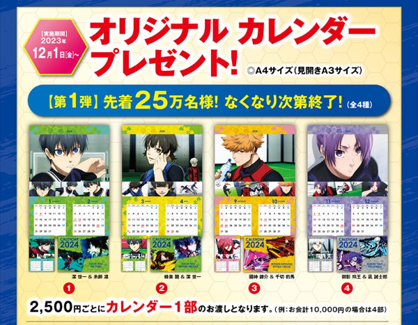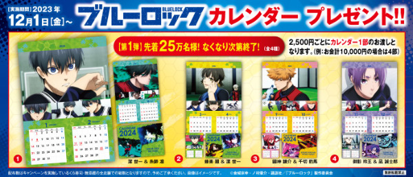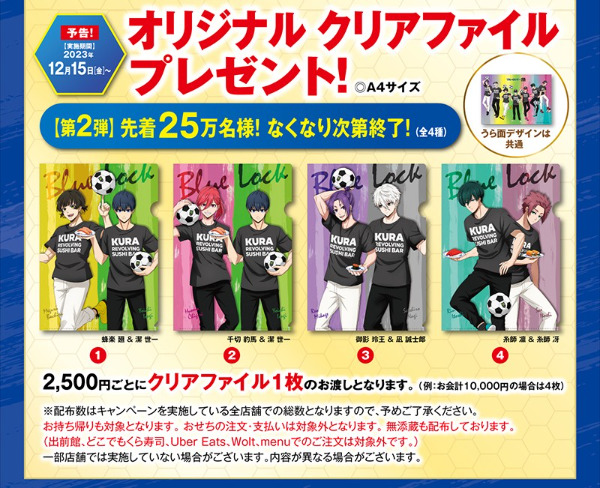 ブルーロック×くら寿司コラボキャンペーン!2023年12月1日(金)から2024年カレンダーやクリアファイルを会計2,500円ごとにブレゼント!潔世一や糸師凛、蜂楽廻などそれぞれ全4種類ずつラインナップ♪先着25万名なのでお早めに♪