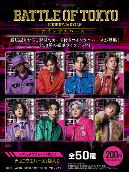 BOTバトルオブトーキョー(BATTLE OF TOKYO)のカード付きツインウエハースの2023新作が2023年10月30日よりコンビニ、スーパーなど全国量販店お菓子売り場で発売開始!45人のキャラクターに各チームのSPカード5種を含めた全50種をラインナップ♪新規撮りおろし写真を使用した両面フルデザインのメタリックプラカードが豪華♥取扱い販売店、カード種類をチェック!