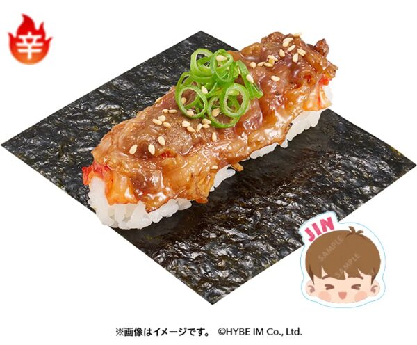 「ポッサム風にぎり」は、韓国料理“ポッサム”をイメージした限定メニュー!ジューシーでやわらかな豚肉に、ピリッと辛いキムチが絶妙にマッチ。1皿ごとに「BTS Island:インザソム」限定のピック(全7種からランダム)が1本付いてくる