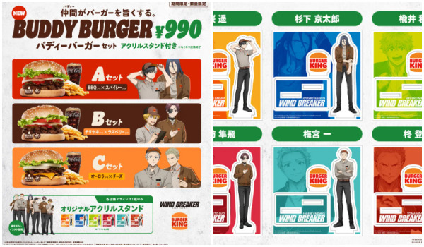 バーガーキング×ウィンドブレーカー(WIND BREAKER)がコラボ決定!アクリルスタンド付きセットが登場!全6種類・1店舗1デザインが配布されます。近くのバーガーキングに配布されるデザイン気になる♡