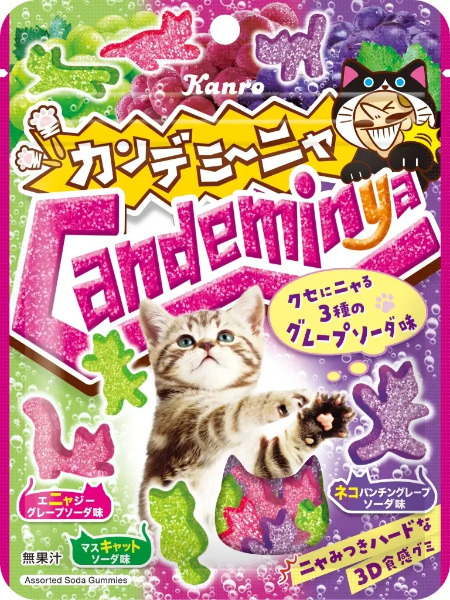 カンロ株式会社より、「猫の日」にちなんで「カンデミーニャグミ」が2024年2月13日(火)より発売されます!グミの形は7(ニャニャ)種類+出会えたらラッキーな肉球型があります♡パッケージは5種類で猫にまつわる小ネタがちりばめられています♪フレーバーは「エニャジーグレープソーダ味」「マスキャットソーダ味」「ネコパンチングレープソーダ味」の3種類♡