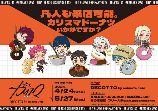 超人的シェアハウスストーリー「カリスマ」がアニメイトカフェとコラボし、「凡人も来店可能なドーナツ専門店」が開催されます♪お店の名前から魅力的です!さらに、キャラも7人のカリスマが全員登場してくれるので嬉しすぎます♡カリスマドーナツなどメニューを注文すると、ランダムで特典コースターがもらえちゃいます♪何がもらえるかはお楽しみです♡