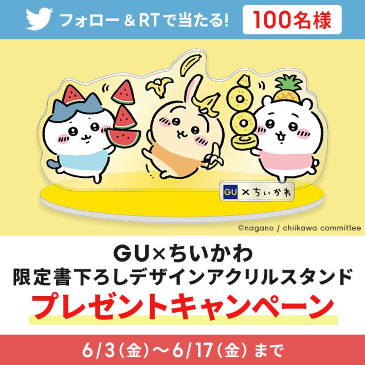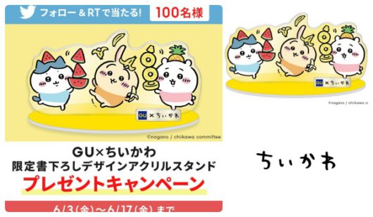 期間中、ジーユー公式Twitterアカウント「GU(ジーユー)」(@gu_global)をフォローし、GU×ちいかわアクリルスタンドプレゼントキャンペーンに関する当社投稿についてハッシュタグ「#GUちいかわのコラボ欲しい」をつけて引用リツイートした方の中から、抽選で100名様に、GU×ちいかわ限定書下ろしデザインアクリルスタンド1個がプレゼントされます。