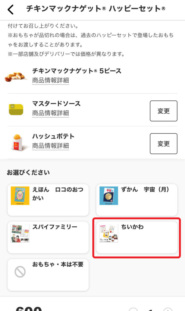 マクドナルドのハッピーセットは大人も頼めるから嬉しいね♪ ちいかわシールほしいからマックデリバリーで頼もうと思ったけど、うちのエリアでデリバリーだとちいかわシール付かないみたい(注文画面で確認済み)。けど、妹の家のエリアだとマックデリバリーでもちいかわ選べたみたいなので、これは配達場所によって違うみたいですね。