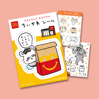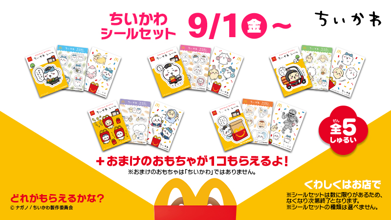 マクドナルド(マック)にて、初めてのちいかわコラボハッピーセットが2023年9月1日よりスタート!おまけはクルー姿の働くちいかわたちのシール全5種類です。接客するちいかわ・ハチワレ・モモンガに、マックデリバリーバイクに乗ったうさぎの絵柄がラインナップ。なかまたちのシールには、くりまんじゅう、鎧さん、ラッコも登場するよ♪シールプラスおまけのおもちゃも1個もらえます。