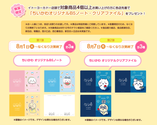 イトーヨーカドー店頭で対象商品4個以上購入の方に、各店先着で「ちいかわオリジナルB5ノート・クリアファイル」をプレゼント!