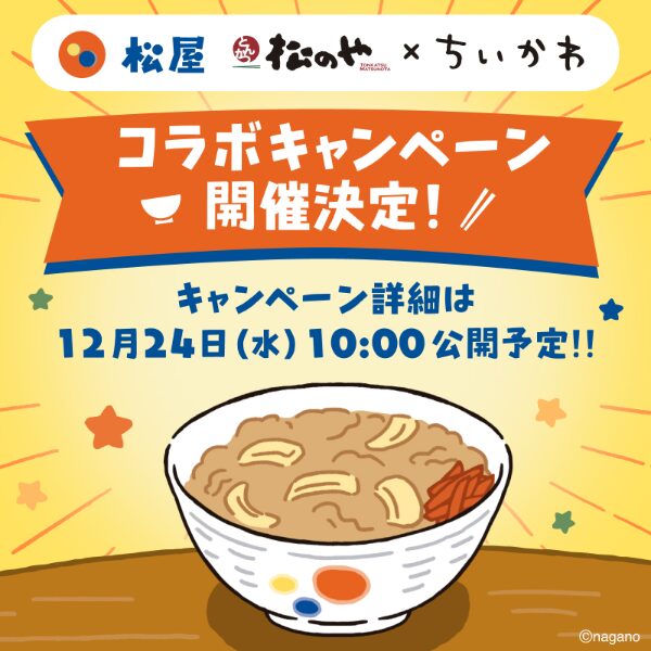 人気牛丼チェーン「松屋」と、ナガノ氏による漫画『ちいかわ』の夢のコラボレーションが発表された。松屋の公式Xアカウント(@matsuya_foods)から12月19日に投稿された告知によると、コラボ企画の詳細は12月24日(水)午前10時に公開予定。