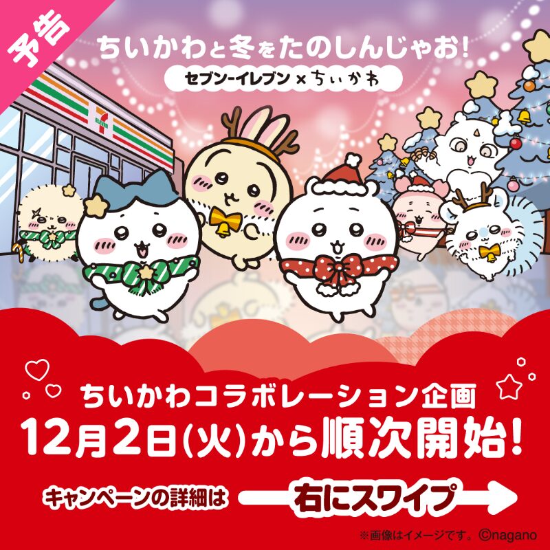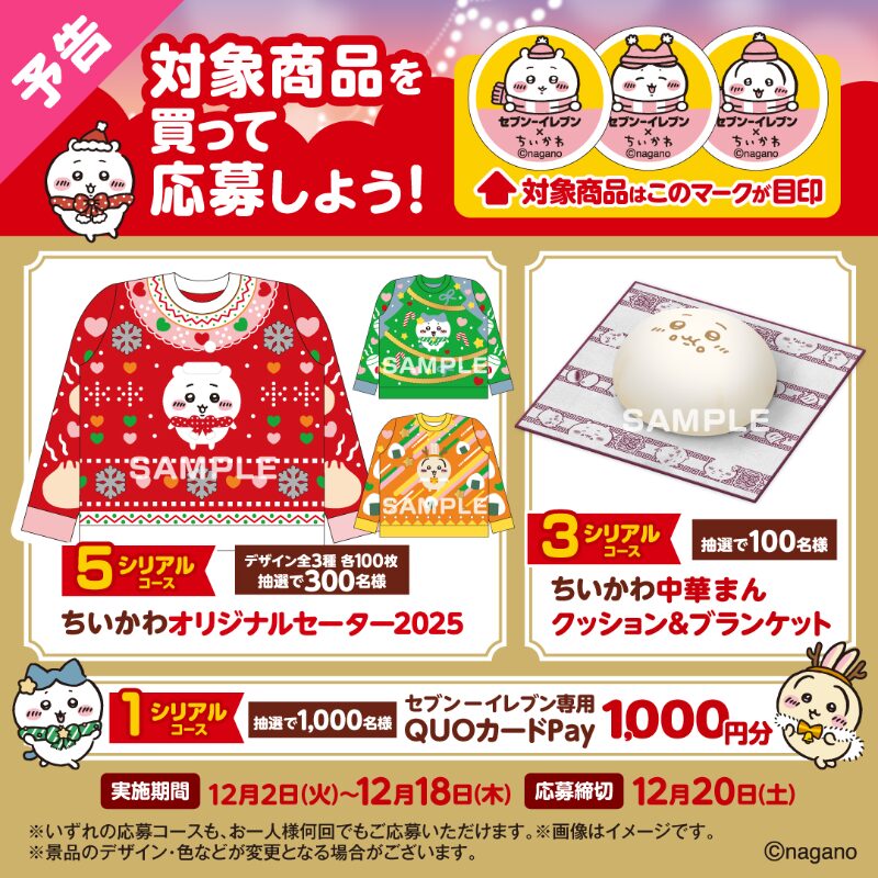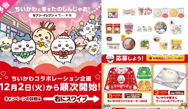 ・ちいかわ×セブン限定メニュー&お菓子登場 ・応募でオリジナルセーターやクッションが当たる ・期間は12/2~12/18、締切12/20
