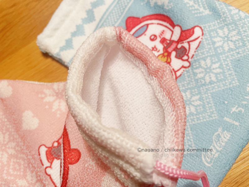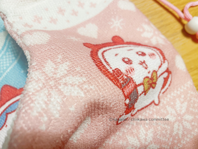 表裏で背景の配色が異なっており、リバーシブルで雰囲気を変えてたのしめます。4匹の背景デザインもそれぞれ違い、4種類。ちいかわは氷の結晶とハート、ハチワレはトナカイと雪の結晶、うさぎはスノーマン(雪だるま)とハート、モモンガはクリスマスツリーが描かれています。