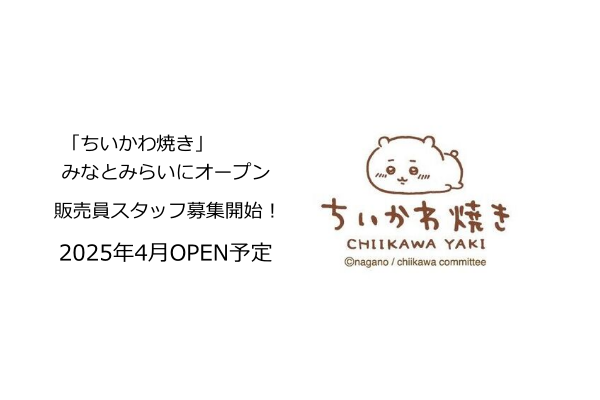 「ちいかわ焼き」が2025年4月に横浜みなとみらいのワールドポーターズにオープン予定🎉かわいいちいかわ焼きやグッズが並ぶ、素敵な空間での勤務チャンス✨Q.どこで働ける?A.神奈川県みなとみらい横浜ワールドポーターズ。Q.いつから?A.2025年4月からオープン予定!