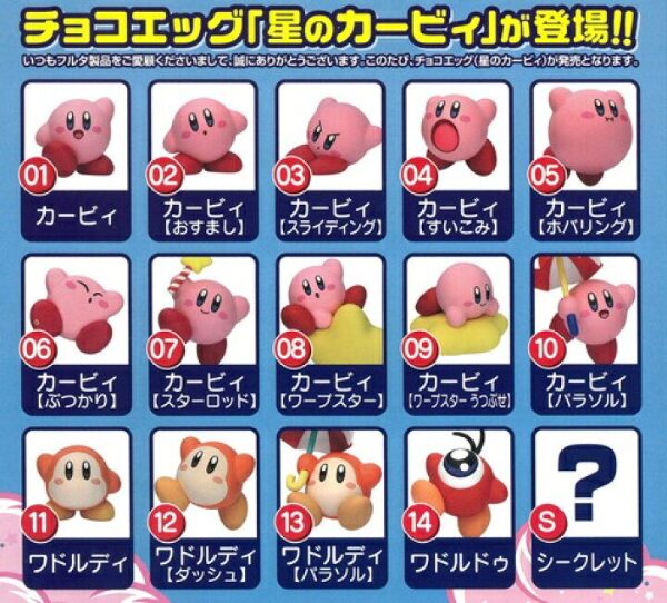 チョコエッグの中には、彩色済みのフィギュアが1つランダムで入っており、今回はカービィの様々なポーズや、人気キャラのワドルディ・ワドルドゥもラインナップに登場。