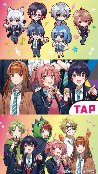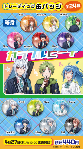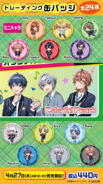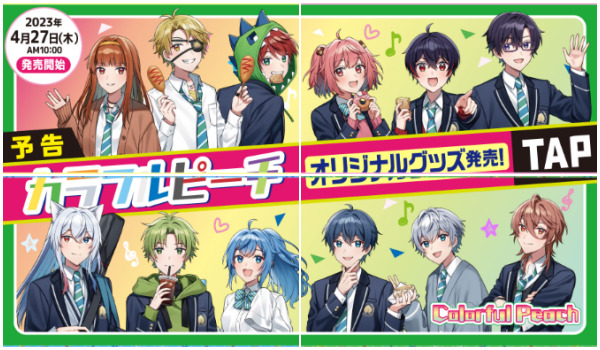 ファミリーマートの対象店舗にて、大人気ゲーム実況グループ「カラフルピーチ」のグッズが2023年4月27日(木)より販売されます。アクリルスタンドと缶バッジをラインナップ。制服姿でファミマの商品を食べている描き下ろしイラストがかわいい♡