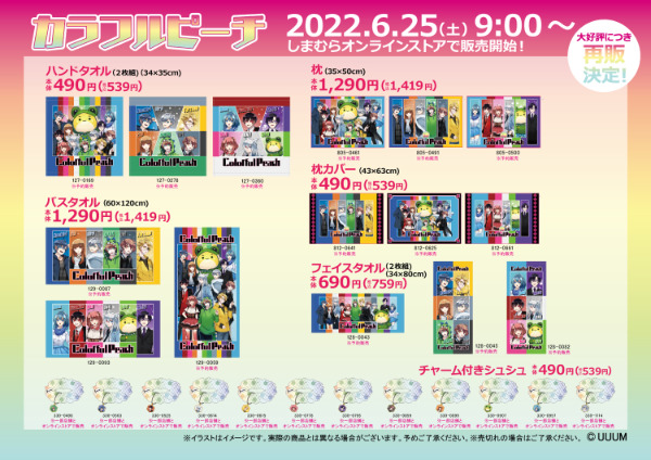 しまむらにて、からぴち(カラフルピーチ)とのコラボグッズ第2弾が2022年6月25日より発売。 なりきりフード付きTシャツや巾着、クッション、トートバッグなどをラインナップ。 ハンドタオルやバスタオル、パジャマ、シュシュなど大好評につきオンラインストアで再販するアイテムも。