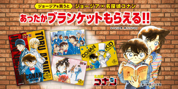 ジョージアと名探偵コナンのコラボキャンペーンが始まります!イオン等スーパー、量販店などの対象店舗で対象商品を購入するとブランケット(全4種)がもらえます♪数量限定、なくなり次第終了なのでお店へ急げ!