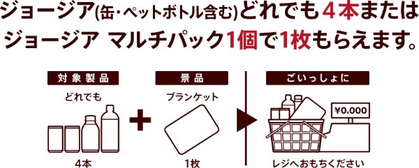 | 条件 | ジョージア(缶・ペットボトル含む)どれでも4本またはジョージアマルチパック1個で1枚もらえます。 |