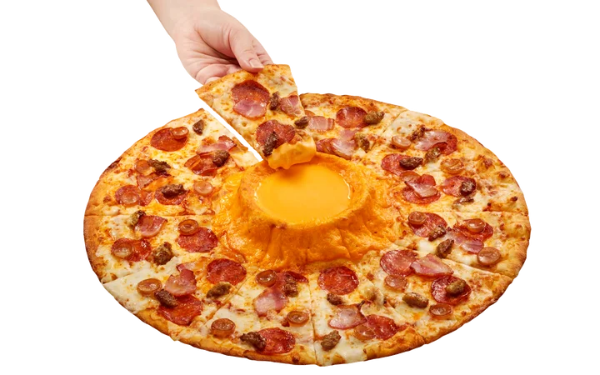| 特長 | ピザの中央に火山のようにそびえ立つ濃厚なチェダーチーズソースにお肉たっぷりのジューシーなギガ・ミートをディップして食べることができる新感覚ピザ。 |