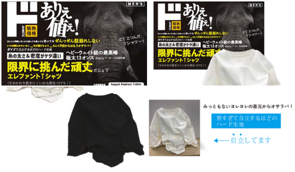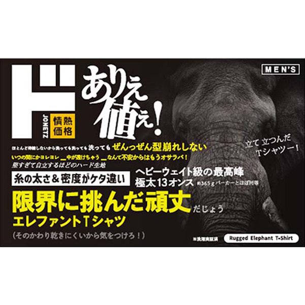 全国のドンキホーテにて「エレファントTシャツ」が発売中です。自立するほど頑丈なヘビーウェイト級の最高峰極太13オンスで糸の太さと密度がケタ違いで、首元がよれない、型崩れしない、中が透けない、硬すぎTシャツ!サイズはM、L、LLを展開!