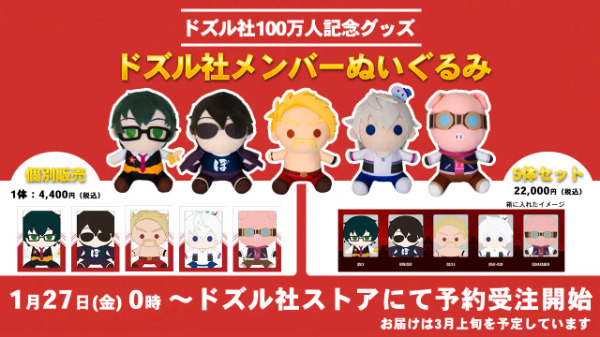 ファン待望の『ドズル社メンバーぬいぐるみ』の予約受注。1体ずつの個別販売とメンバー全員の5体セットを用意。