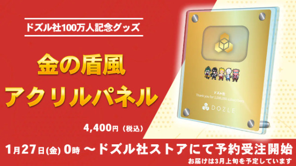 チャンネル登録者数が100万人を達成したユーチューバーが手にすることができる"金の盾"をモチーフにした、ドズル社オリジナルデザインの『金の盾風アクリルパネル』を記念グッズとして予約受注。