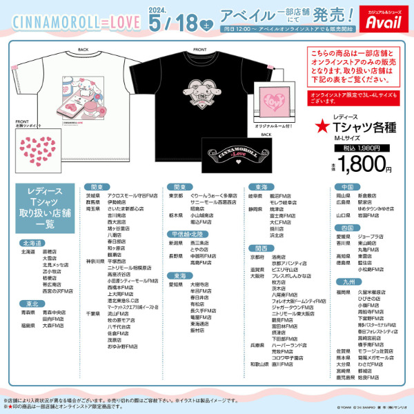 アベイル「イコラブ=LOVE×シナモロール」グッズ発売!2024年5月Tシャツやチャーム、靴下など可愛いラインナップ♡