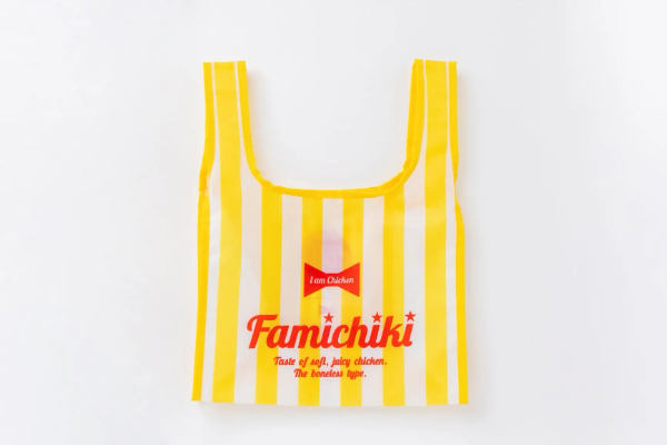 内容:黄色のストライプがインパクトあるファミチキ袋柄のエコバッグとポーチです。次回利用できるファミチキ割引券付き。