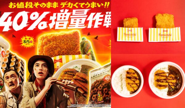 お値段そのまま!中身はざっくり40%増量!🎉ファミリーマート(ファミマ)恒例「ざっくり40%増量作戦」が今年も真夏に登場🍛🍦✨ファミチキやロースかつカレー、チーズケーキまで人気商品が大きくなって続々登場!これは見逃せないっ!