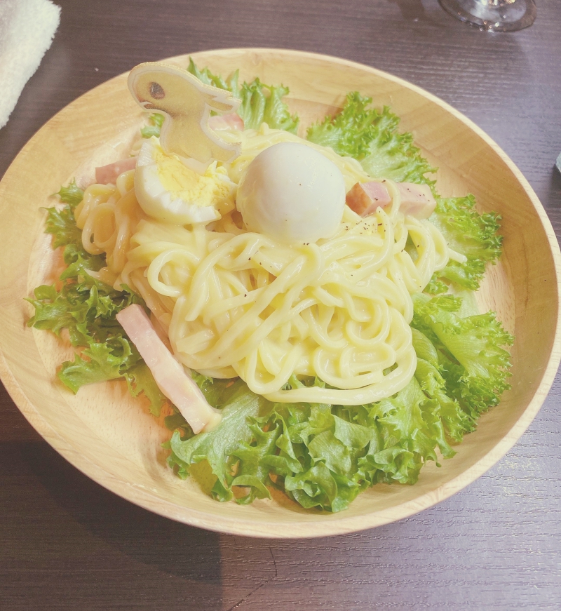 フードメニューもストーリーにまつわるメニューが多数ありますが、その中にプレイヤーが考えたメニューも採用されています。実際にゲームにあるメニューを再現されていたりキャラクターモチーフの可愛いフードもあります。ゲーム内に調理師というジョブがありますが、そのジョブで作れるメニューが実際に食べられるのでこれゲーム内で見た事ある!と楽しくなると思います。その中でプレイヤーが考えたチョコボネストカルボナーラというメニューがありますが、ゆで卵からゲーム内にもいるヒナチョコボが顔を出していたり、パスタがチョコボの巣を見立ててあったりととてもこだわってあり、味もとても美味しかったです。