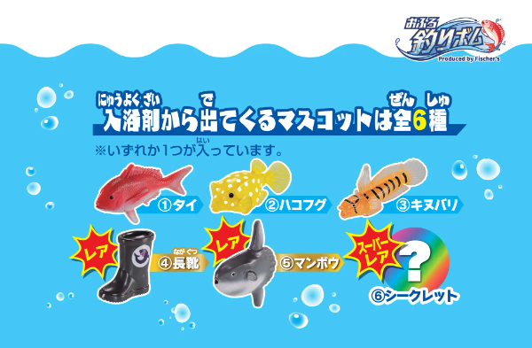 全6種類(タイ、ハコフグ、キヌバリ、長靴、マンボウ、シークレット)のマスコットが入った入浴剤をお湯に入れると、まず「浮き」が湯面に浮かびます。付属の釣り竿の針を使って、この浮きを引っかけて釣り上げることが可能です。入浴剤が溶けるとお湯が少し濁り、マスコットが見えなくなります。そのため、どのマスコットが釣れるかは釣り上げるまでのお楽しみです。釣り上げた後は、浮きをマスコットの台座として飾ることができ、コレクションする楽しみもあります。お風呂で体を動かすとお湯が波立ち、浮きも揺れるため、釣りの難易度が増します。浮きの輪と釣り針のサイズにも工夫がされており、簡単には釣れない絶妙なバランスが実現されています。子どもから大人まで多くの人が楽しいお風呂時間を過ごせるように、遊び心がたっぷり詰まった入浴剤です。