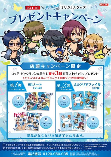 「劇場版 Free!-the Final Stroke- 」とビックリマンチョコなどのロッテ商品とのコラボキャンペーンが開催!2023年11月28日(火)より、全国の総合スーパー「イオン」(北海道、九州、沖縄除く)限定で、ロッテのビックリマン商品含む菓子3個を購入するとFree!FSのオリジナルグッズをプレゼント!第1弾は2023年11月28日(火)よりA5ノート、第2弾は2023年12月5日(火)A4クリアファイルがそれぞれもらえます!まるでビックリマンのキャラクターのような七瀬 遙、橘 真琴、松岡 凛、葉月 渚、竜ヶ崎 怜の5人の描き下ろしイラストです♡