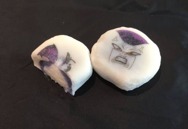 集英社が運営する「週刊少年ジャンプ」の公式ショップ「ジャンプショップ」では、大人気アニメ『ドラゴンボール 超』のフリーザ様をモチーフにした大福が販売されています。2018年7月13日(金)から販売が開始され、多くのファンから好評の一品。SNSでも度々大きな話題となり、10,000リツイートを超える反響を呼び、発売前から注目を集めていました。白い大福生地の中には、ブルーベリー味のクリームとホイップクリーム入り。紫と白のフリーザ様カラーが映えるお菓子デザインになっています。