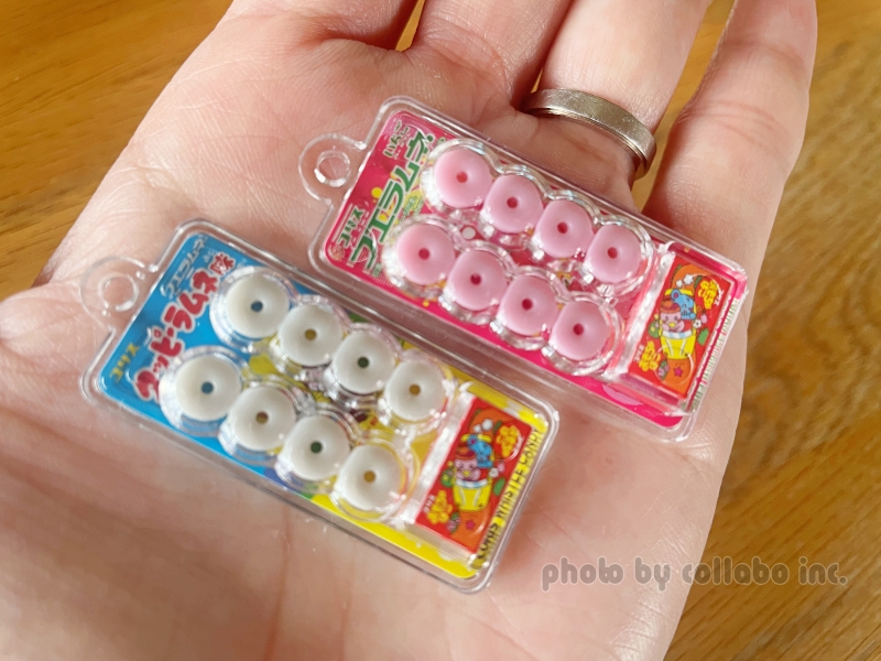 カプセルトイで登場した「フエラムネ ミニチュアマスコット」と比較した写真がこちらです。右がマスコット、左が今回のごめんなサイダー味のおまけです。本当に小さく再現性に驚かされます。小さければ小さいほど可愛く感じてしまいます。