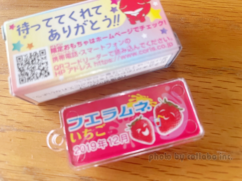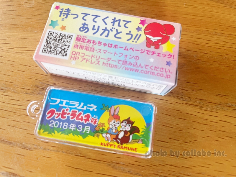 裏面には商品名と発売日が表示されていて50年の歴史の流れを感じることができます。これは歴代フエラムネのミニチュアを集めたくなりますね。おもちゃ箱裏面には「待っててくれてありがとう!」の文字が…コリスのやさしさを感じますね。