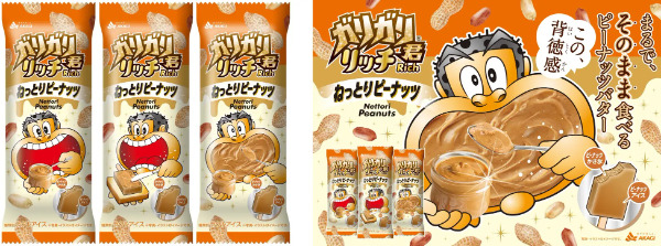 パッケージには、ピーナッツバターを大きな口に運ぶガリガリ君や、ピーナッツアイスをパンに塗るガリガリ君が描かれており、ピーナツの濃厚な味わいをイメージさせるユニークなデザインになっています。食欲の秋に食べたい「ガリガリ君リッチ ねっとりピーナッツ」に注目です。
