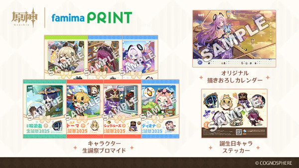 『原神』の人気キャラクターたちの誕生日を記念した「キャラクター生誕祭ブロマイド」や「オリジナル描きおろしカレンダー」、ゲーム内アイテム交換コード付きの「誕生日キャラステッカー」が、2025年1月31日から全国のファミリーマート「ファミマプリント」で発売されます。