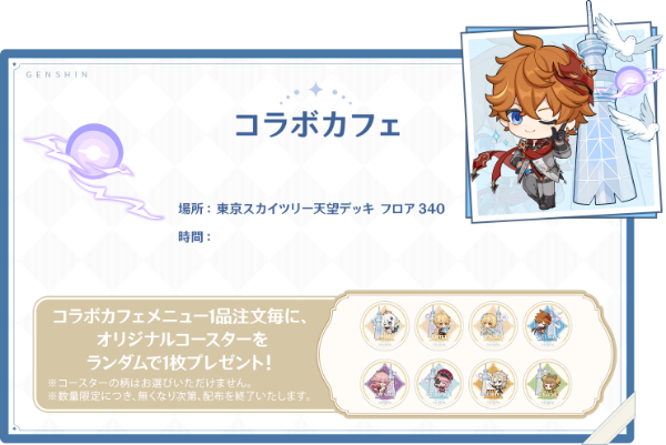 原神コラボカフェ2024inスカイツリー!1メニュー注文毎コースタープレゼント♪場所は天望デッキフロア340