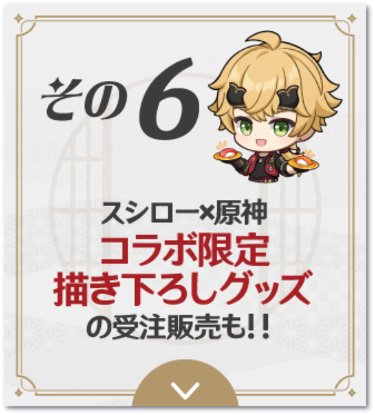 スシローと原神のコラボ限定描き下しグッズの受注販売が予定されています。情報公開は2024年3月6日を予定。