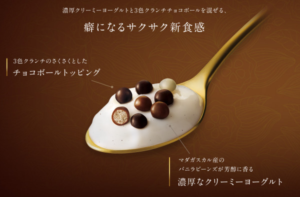 ⚫ マダガスカル産のバニラビーンズが芳醇に香る濃厚なクリーミーヨーグルトに、さくさくとした 3 色クランチチョコボールのトッピングが癖になる新食感と、見た目も楽しい製品です。